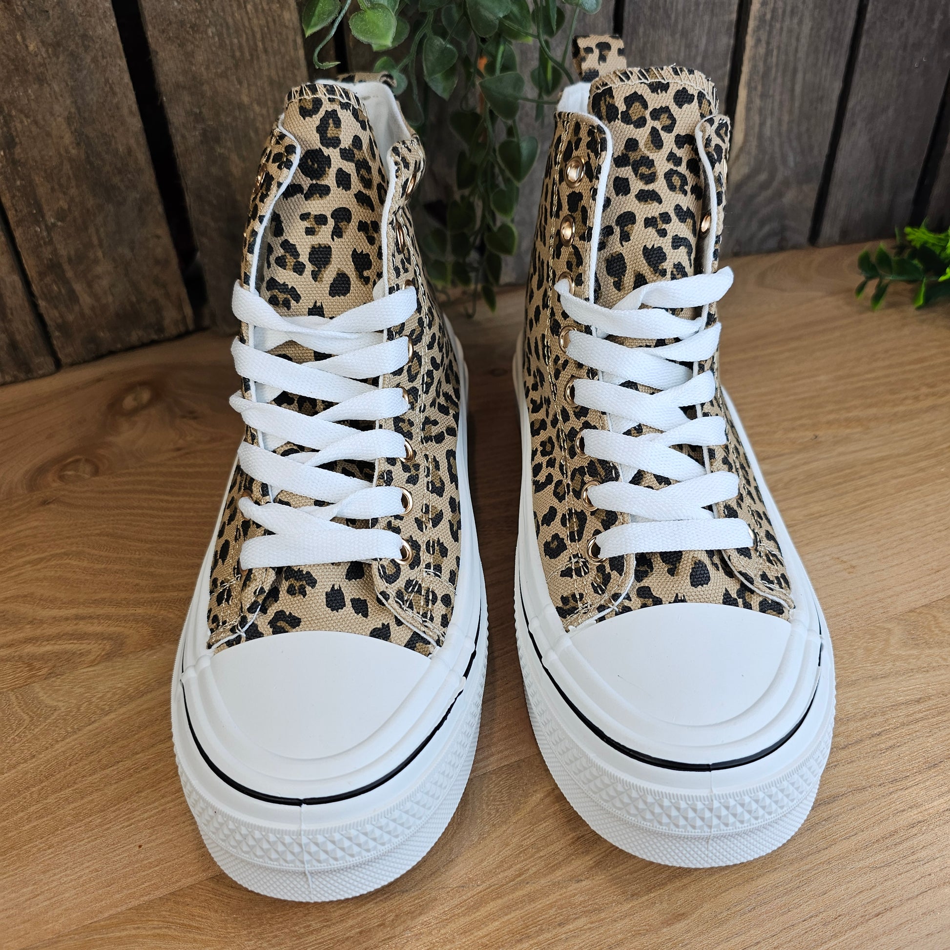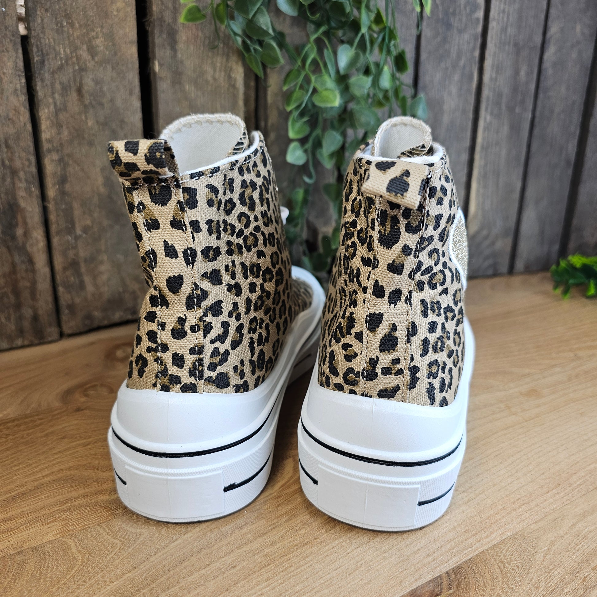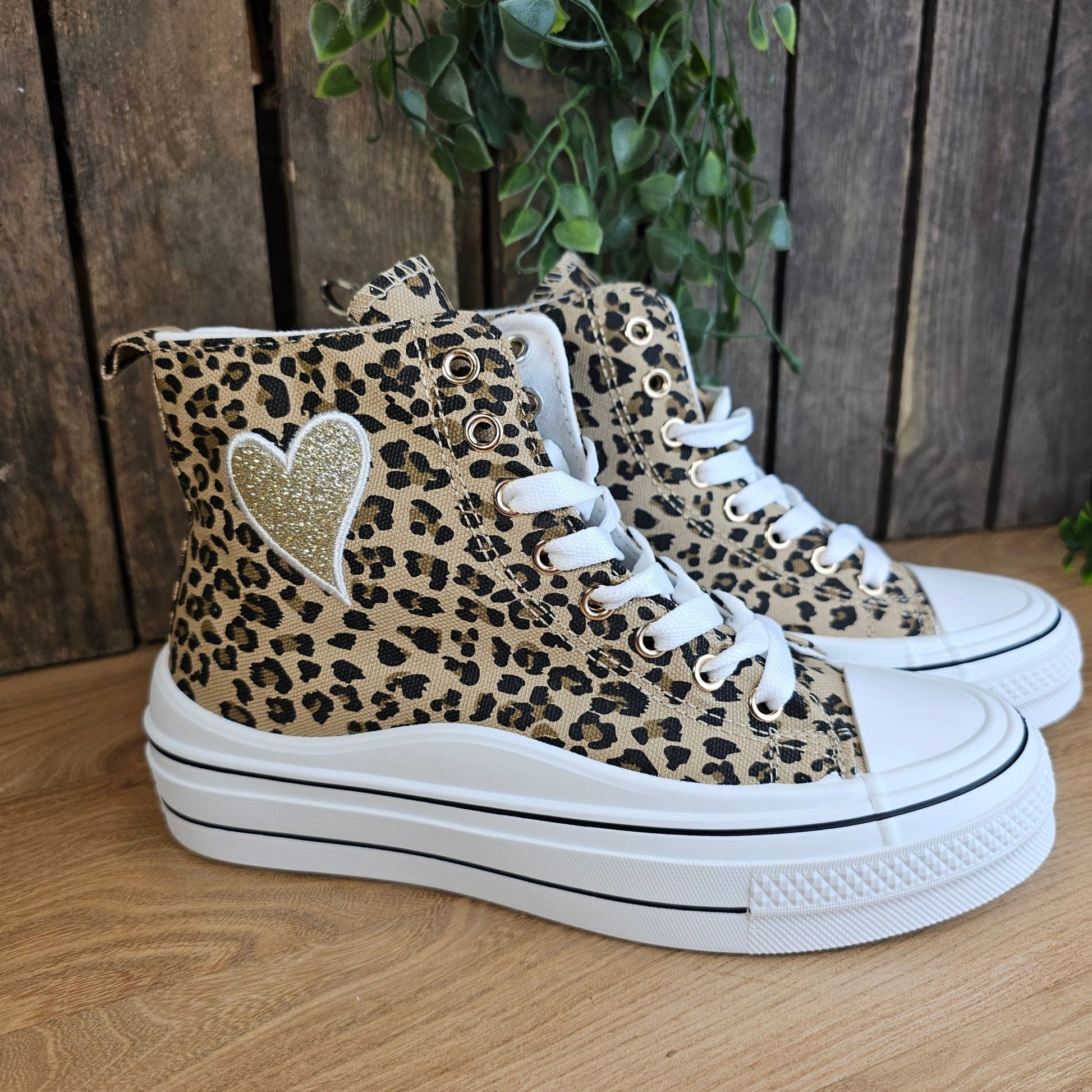 Baskets montantes imprimé léopard avec son joli cœur doré brodé sur le côté de la chaussure.