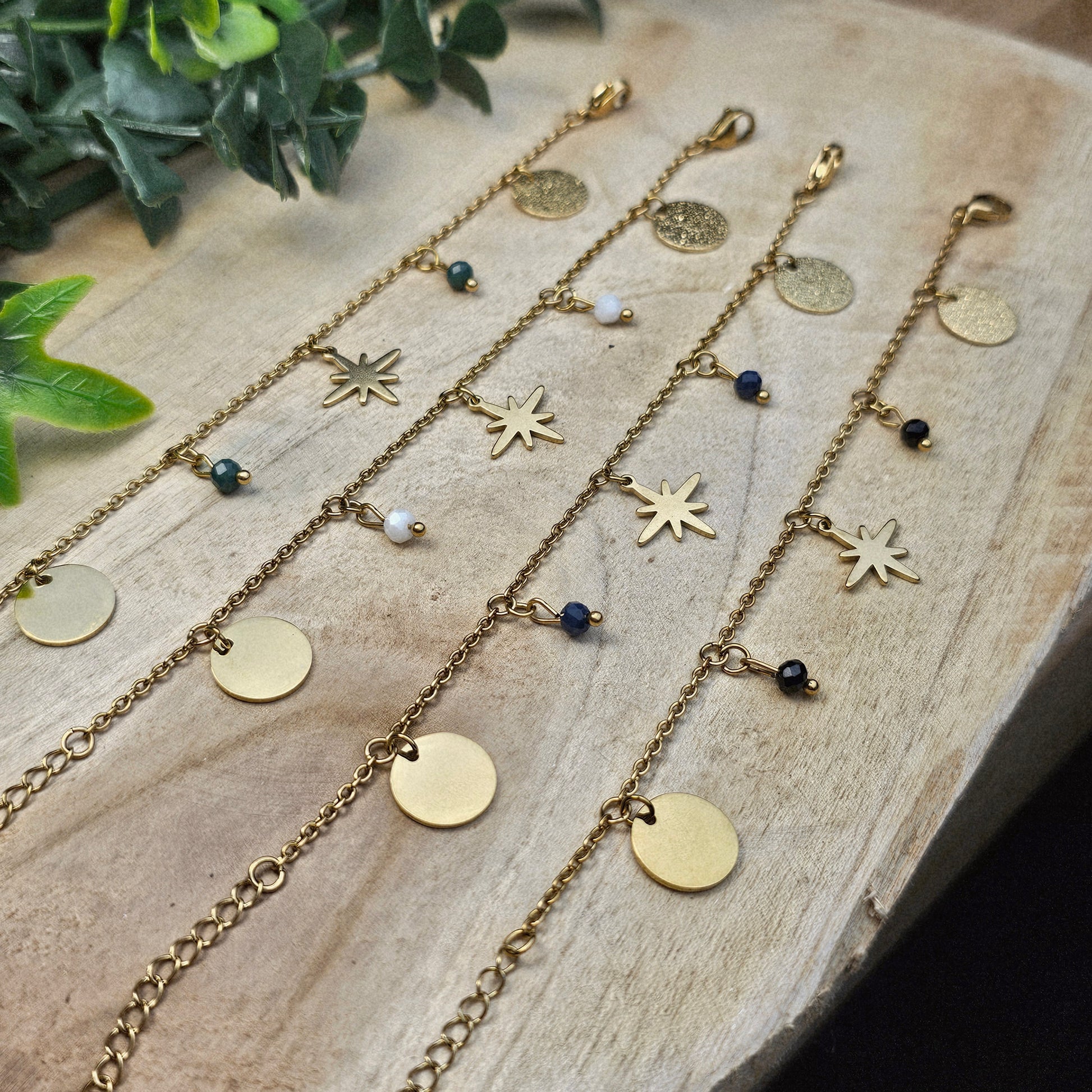 Ce joli bracelet est composé de perles en verre soigneusement sélectionnées et de 3 médailles en acier inoxydable doré. Il est disponible en plusieurs coloris.