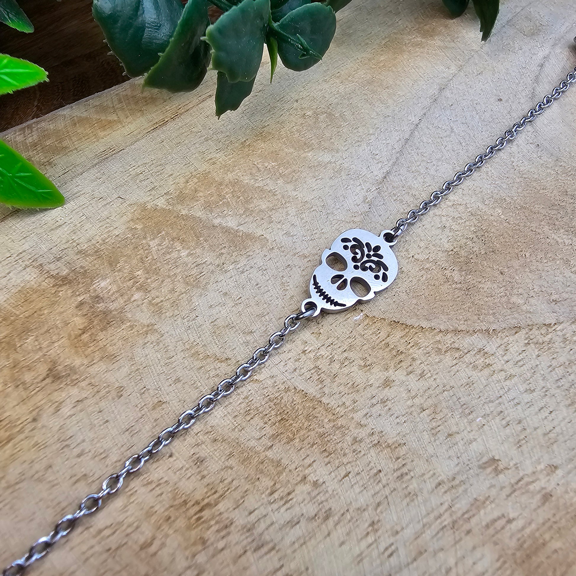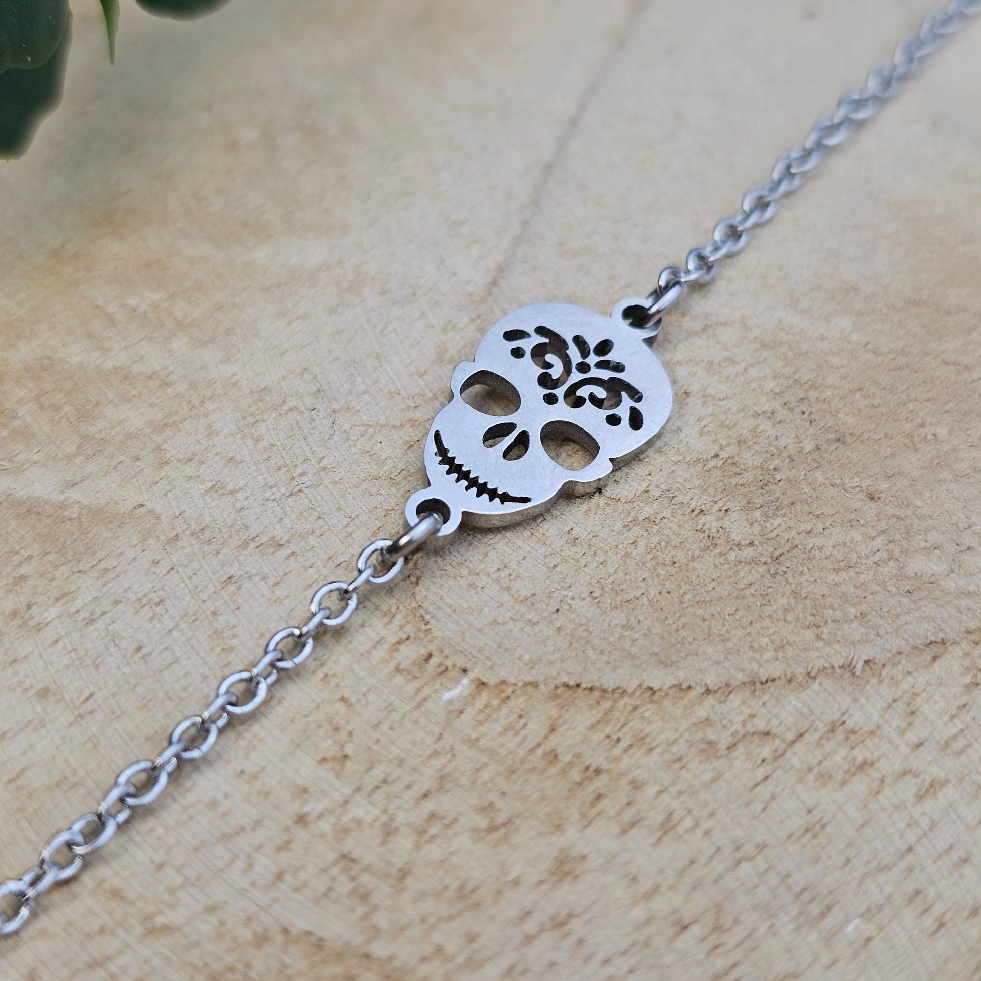 Composé avec une médaille tête de mort et une chaîne fine en acier inoxydable.