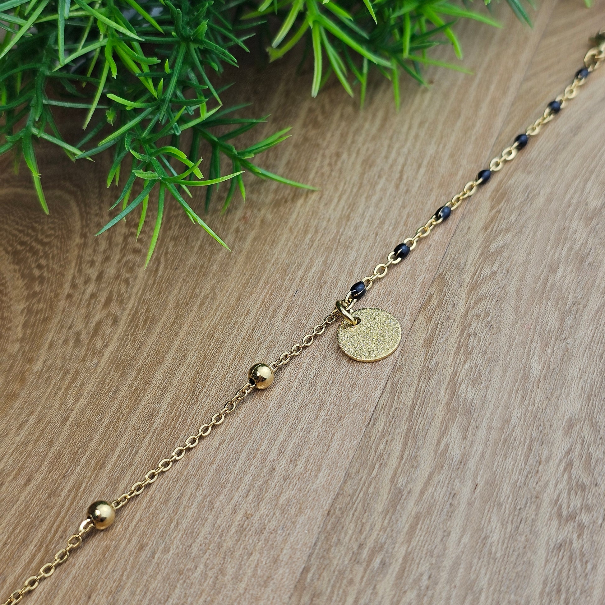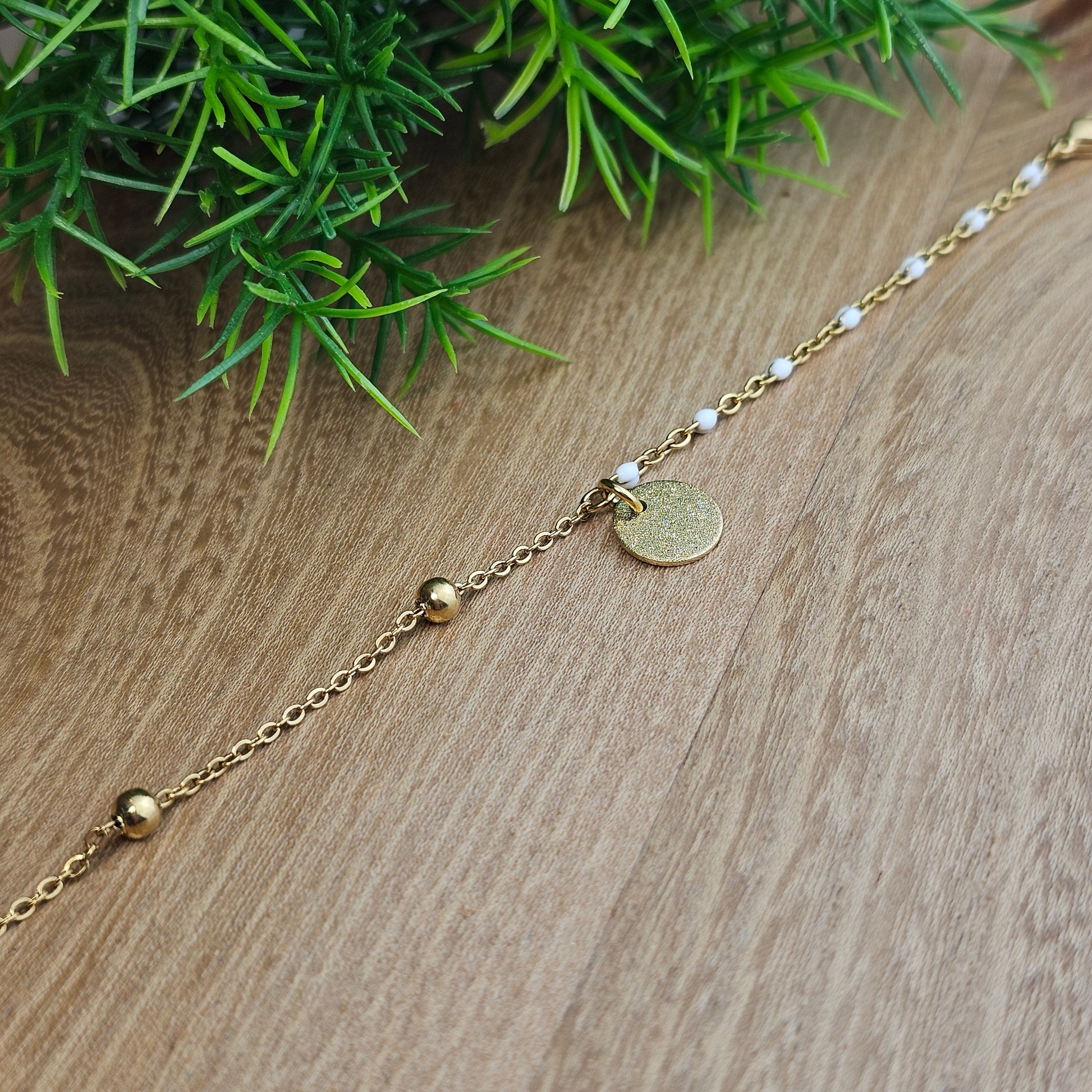 Composé avec une jolie médaille pailletée et une chaîne fine en acier inoxydable et perles en résine.