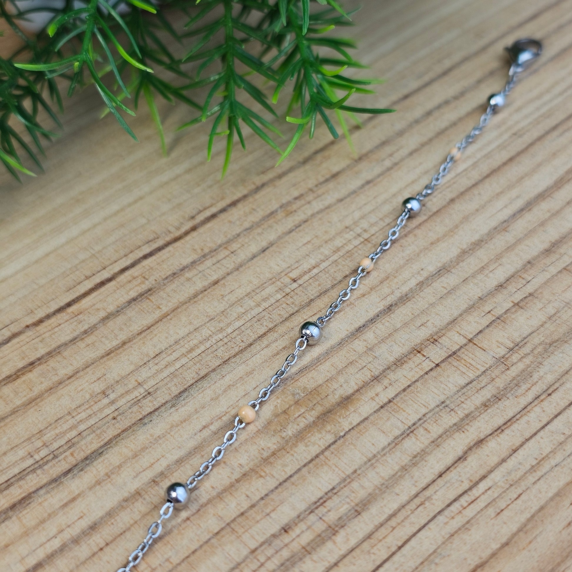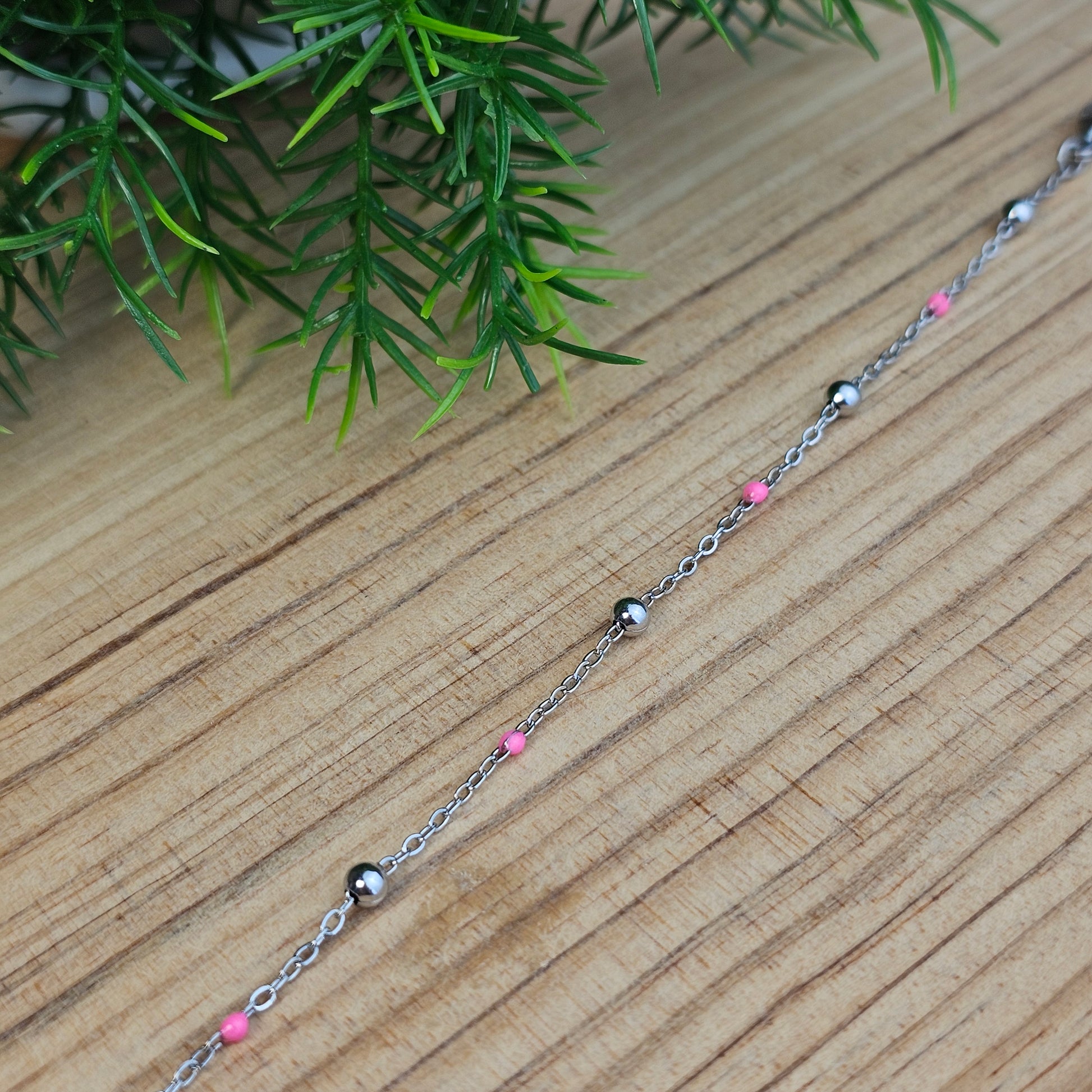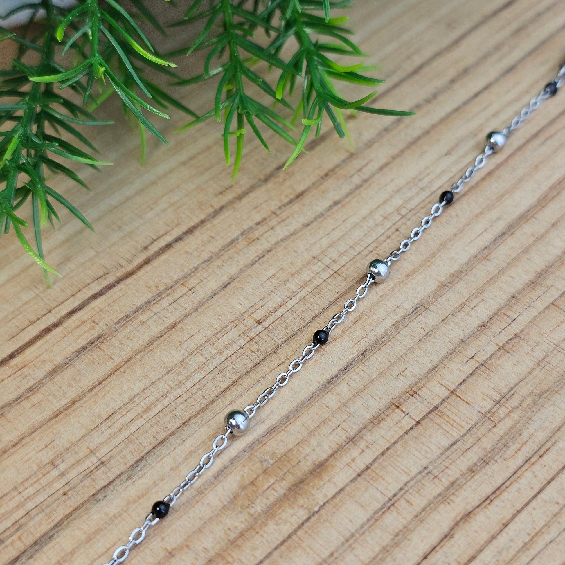 Composé avec une chaîne fine en acier inoxydable et perles en résine.