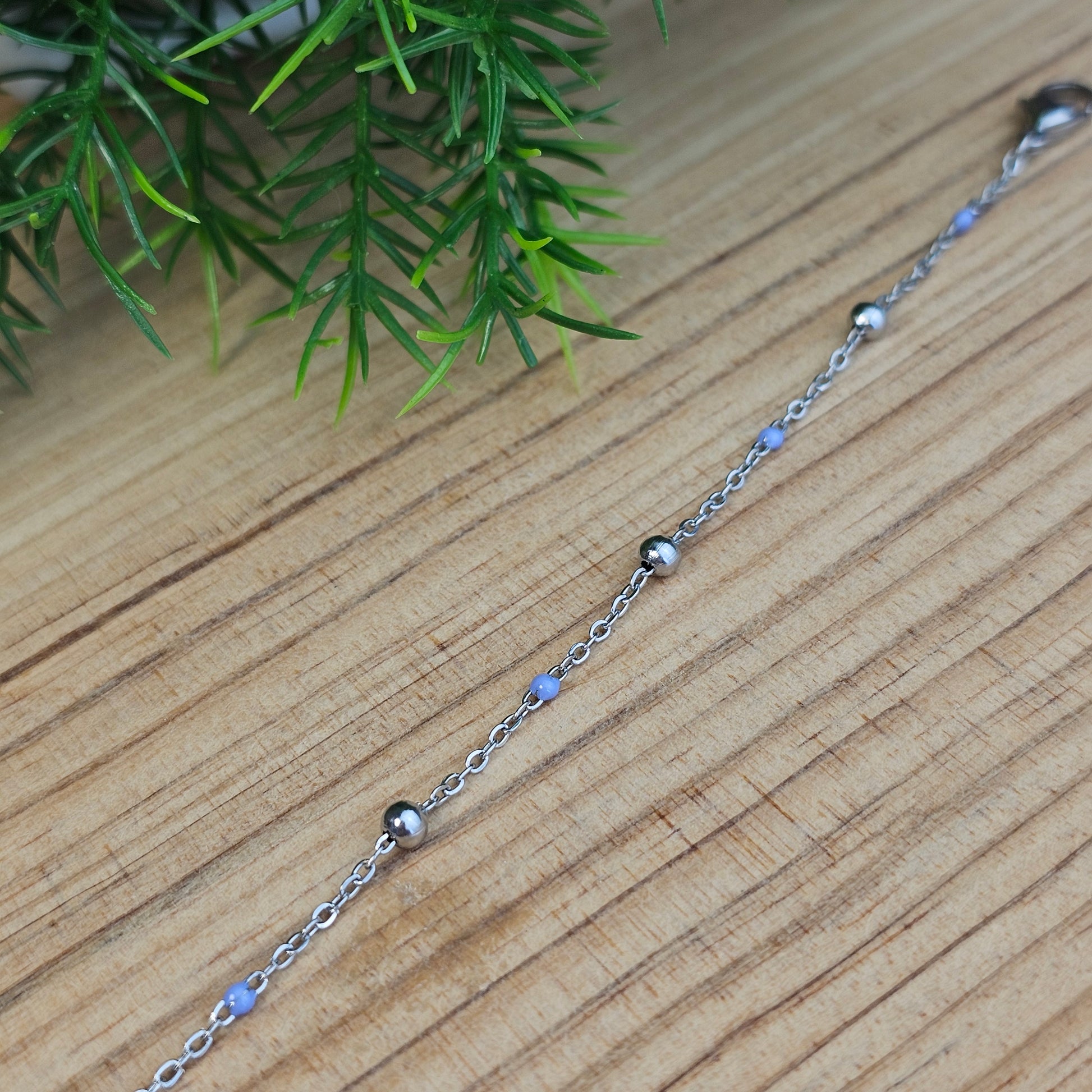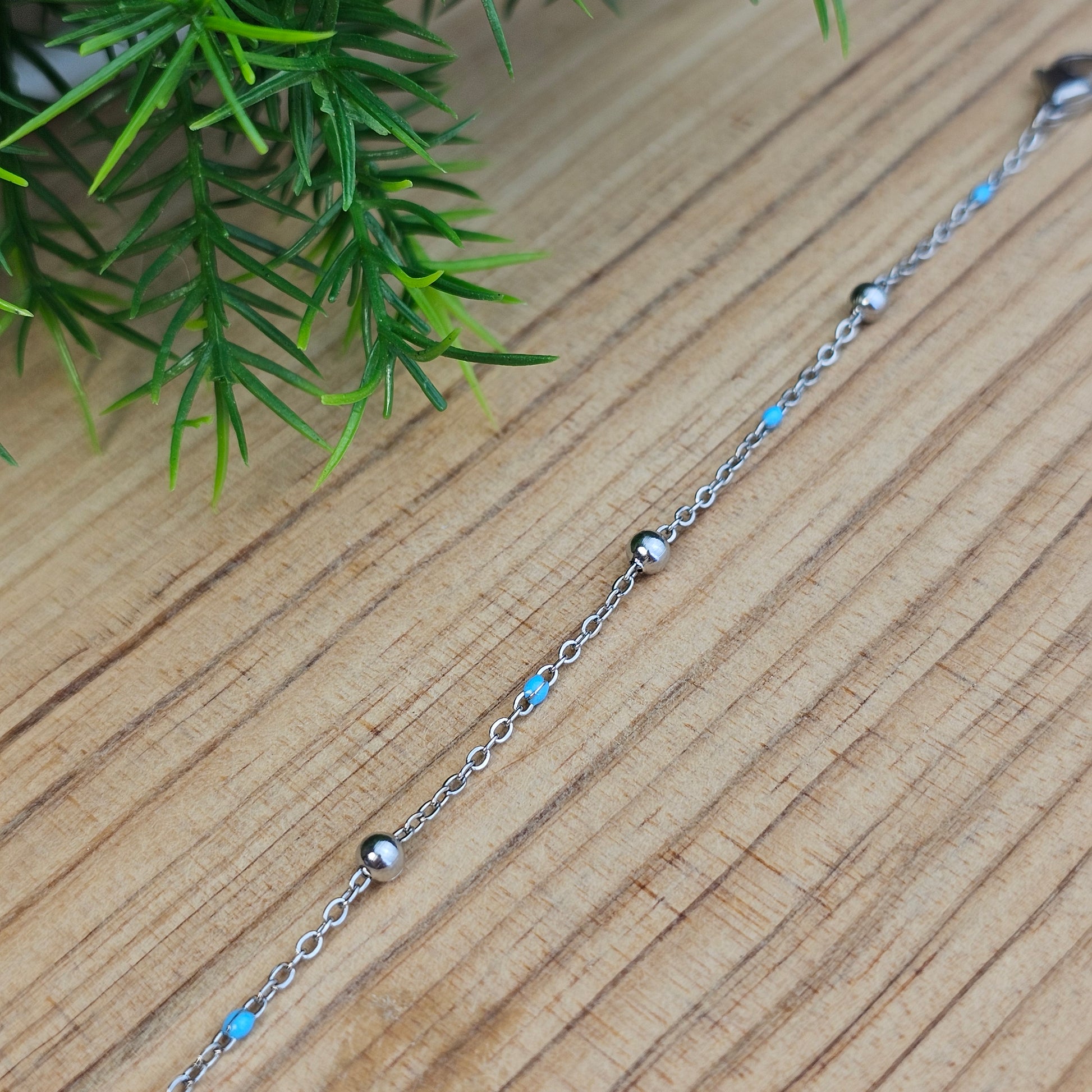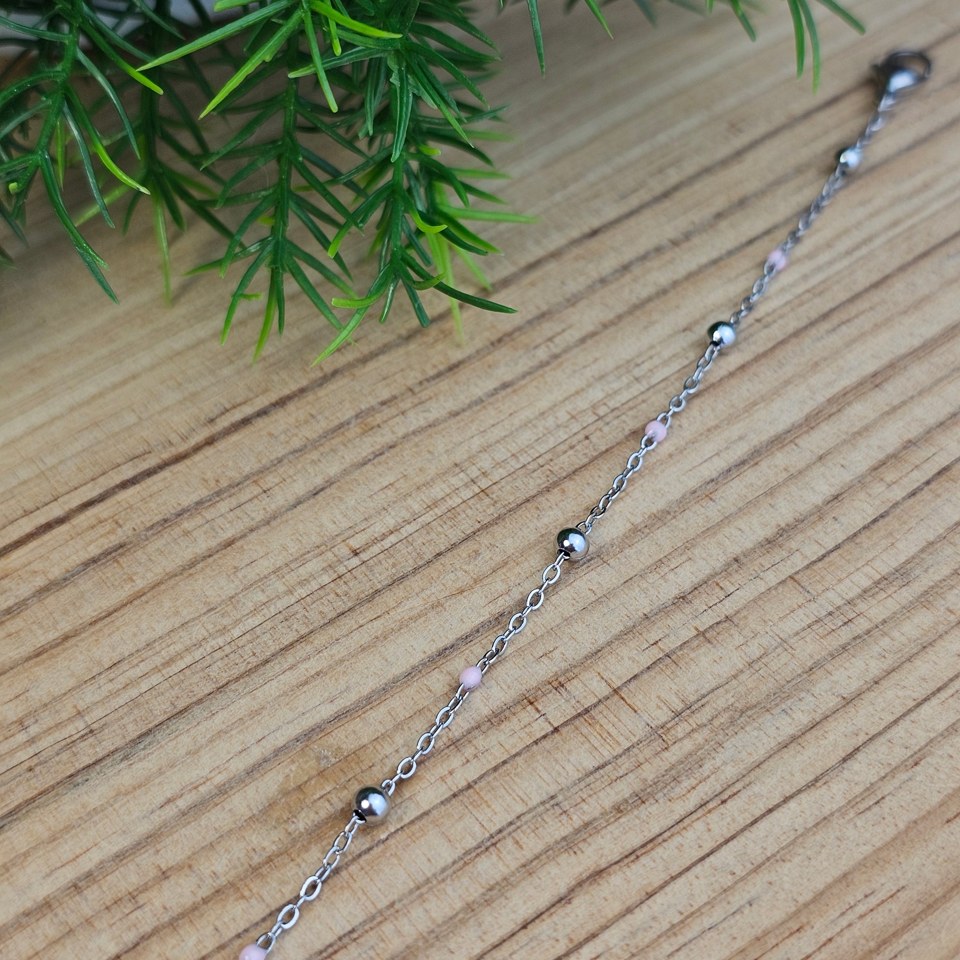Composé avec une chaîne fine en acier inoxydable et perles en résine.