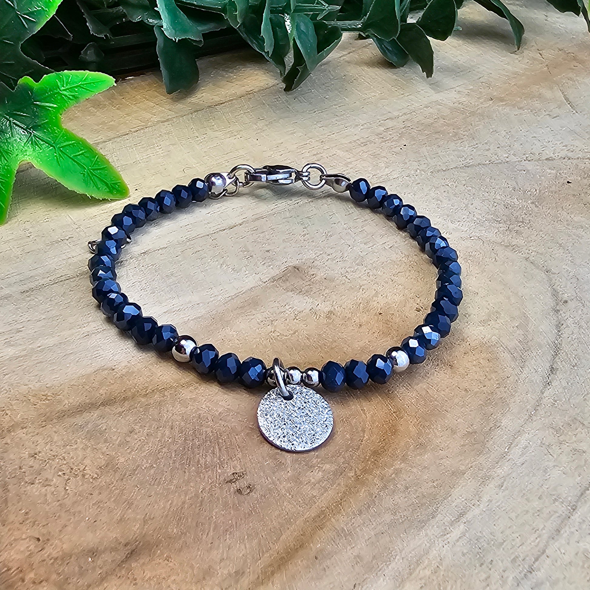 Ce joli bracelet est composé de perles en verre soigneusement sélectionnées et d'une médaille effet pailletée en acier inoxydable. Il est disponible en plusieurs coloris.