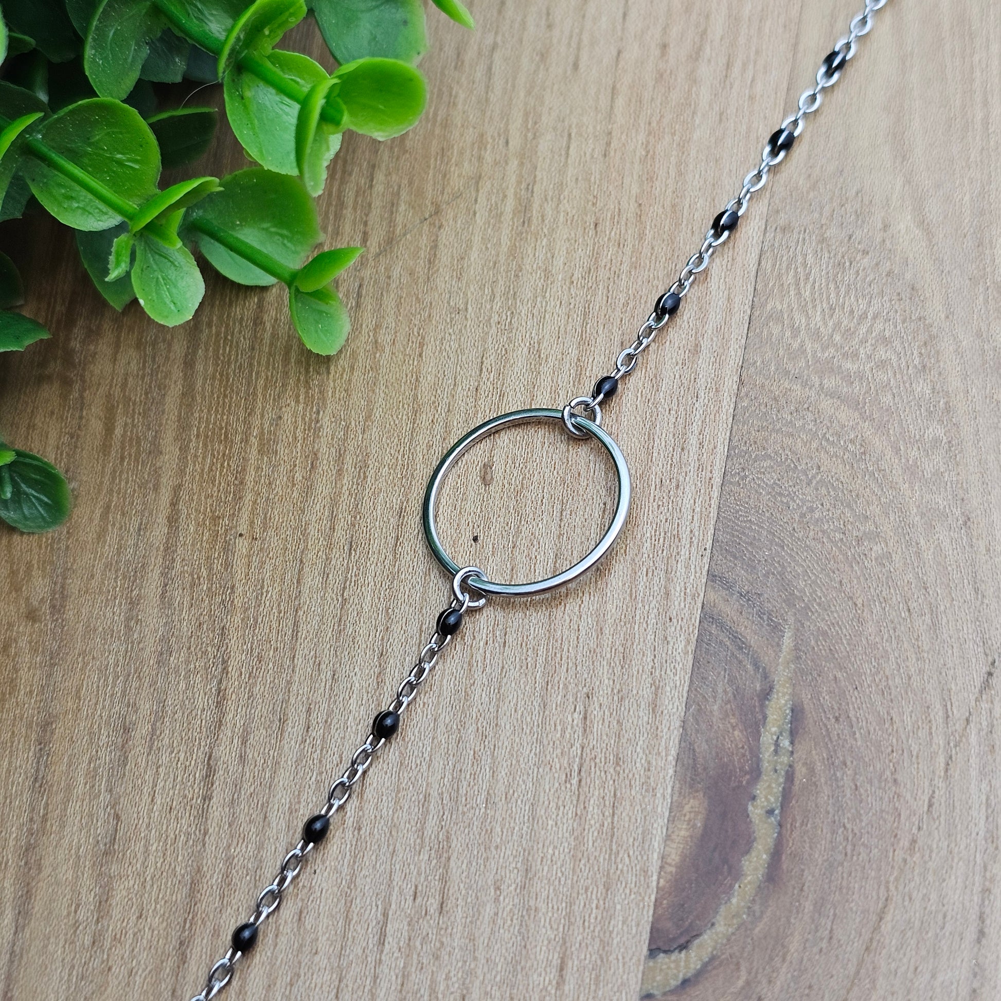 Composé avec une chaîne fine en acier inoxydable et perles en résine.