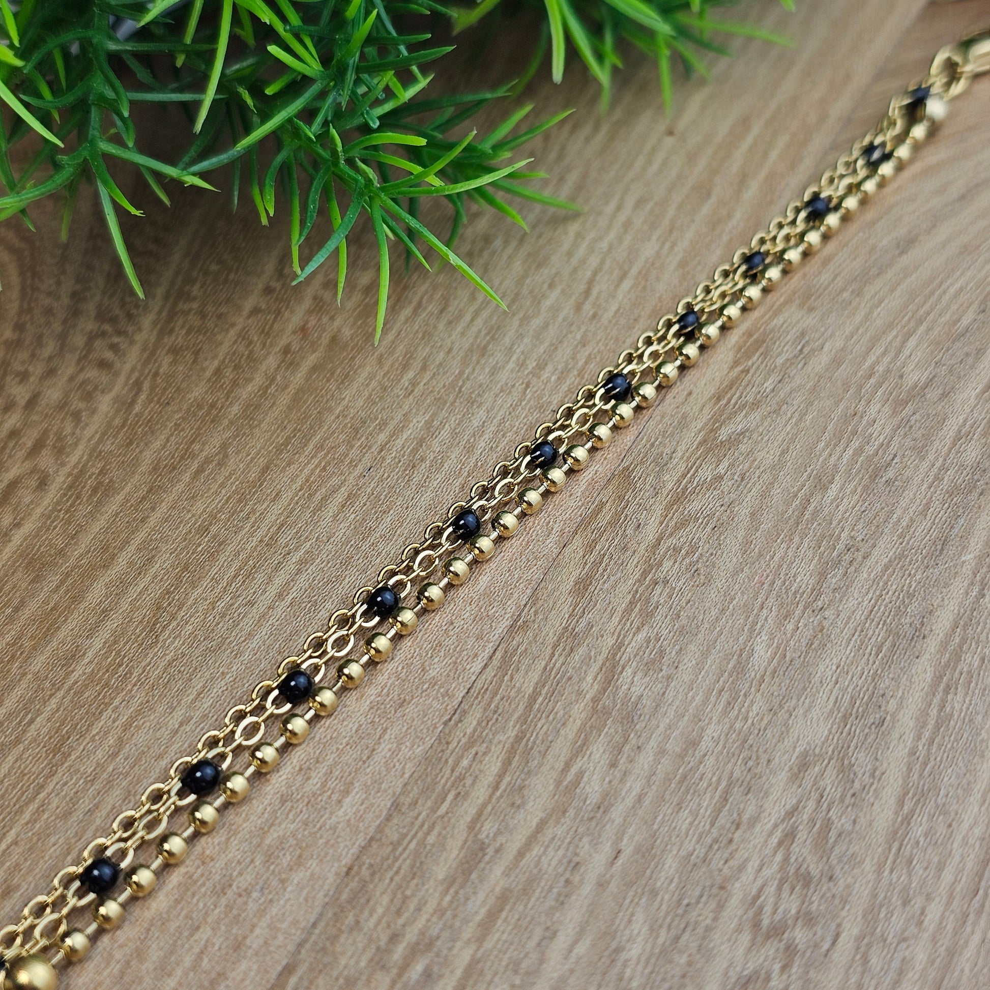 Composé de 3 chaînes différentes (une chaîne fine en acier inoxydable, une chaîne billes et une chaîne avec des perles en résine colorées).