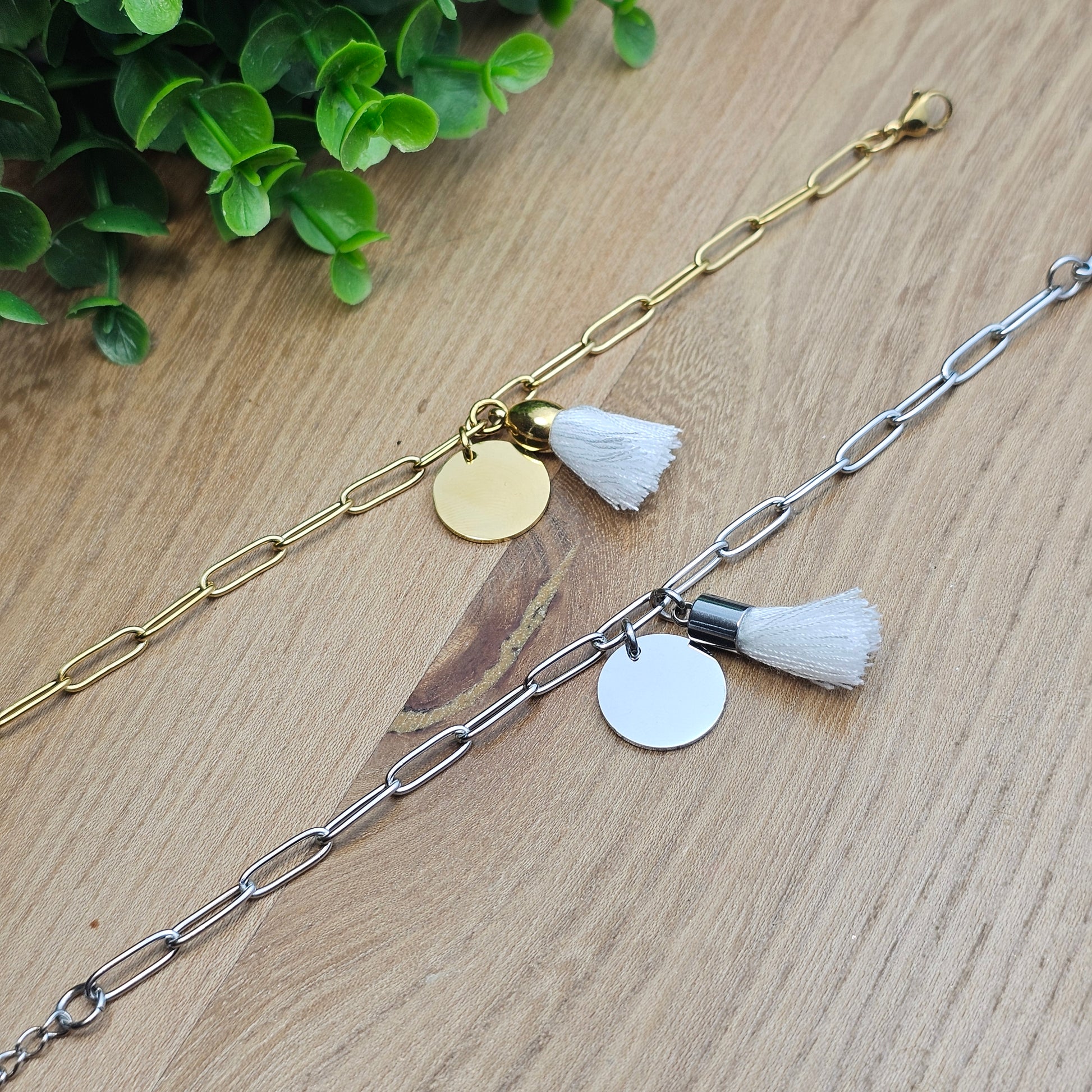 Un bracelet maille agrafe avec sa pampille en acier inoxydable et son pompon.