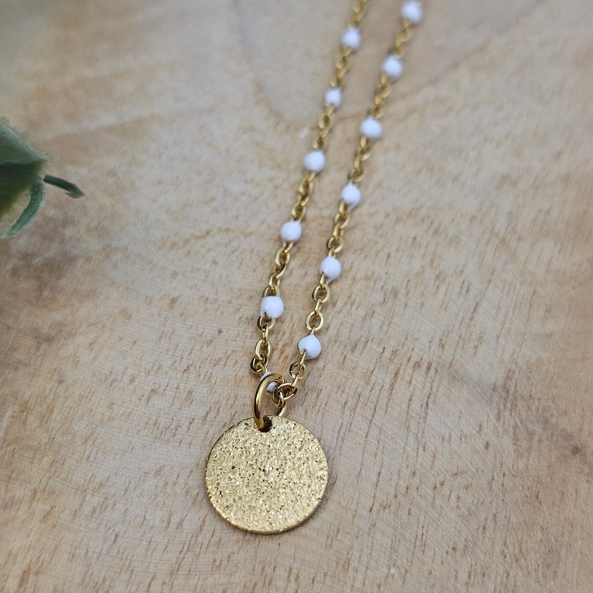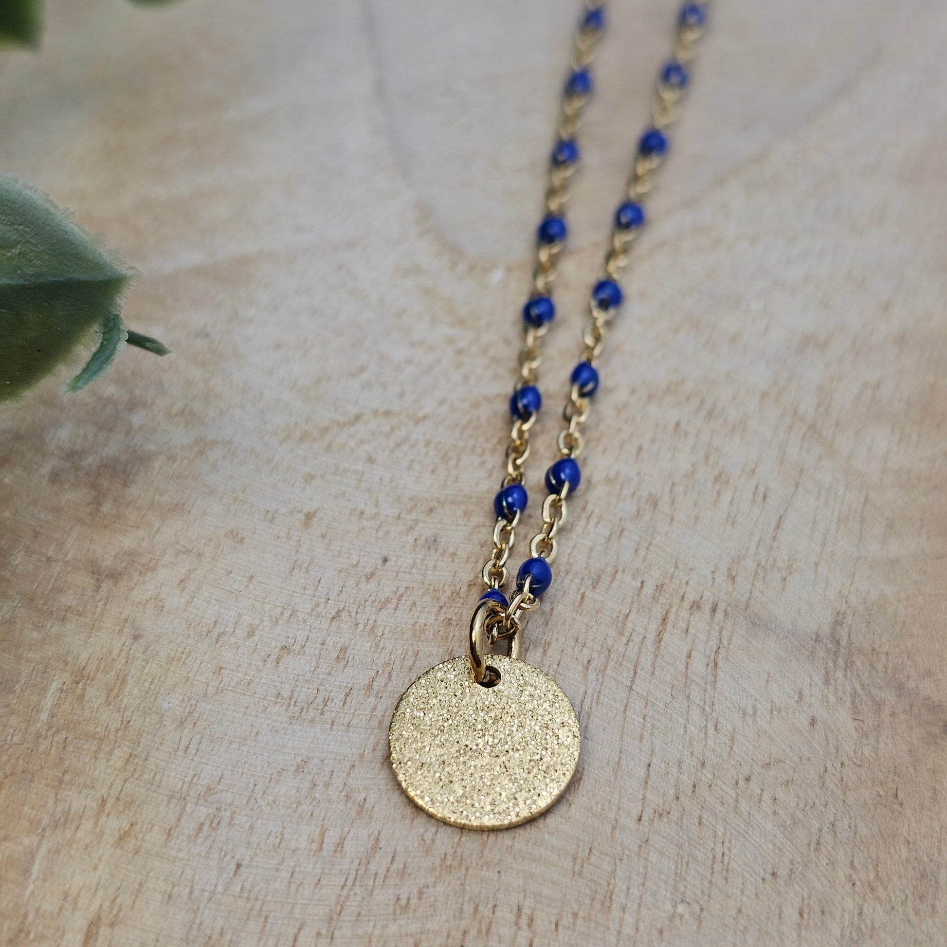 Collier en acier inoxydable doré. Composé d'une chaîne avec petites perles en résine et d'une médaille effet pailletée.
