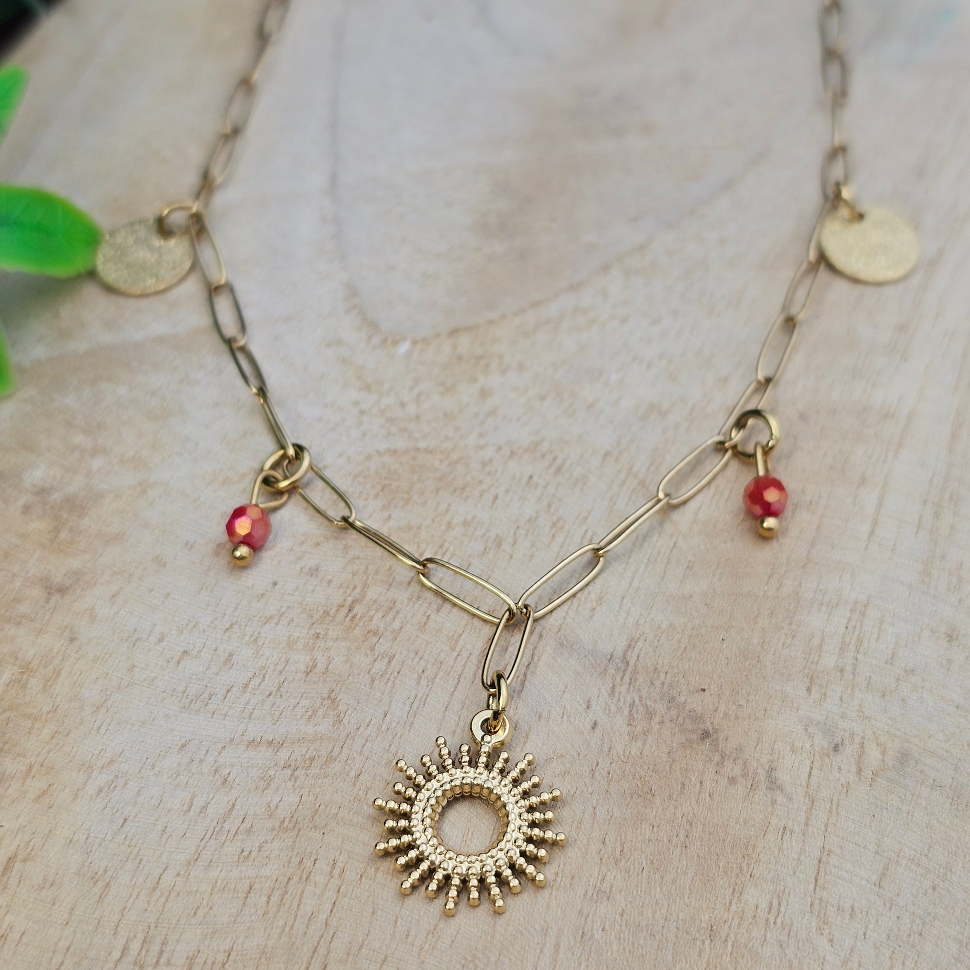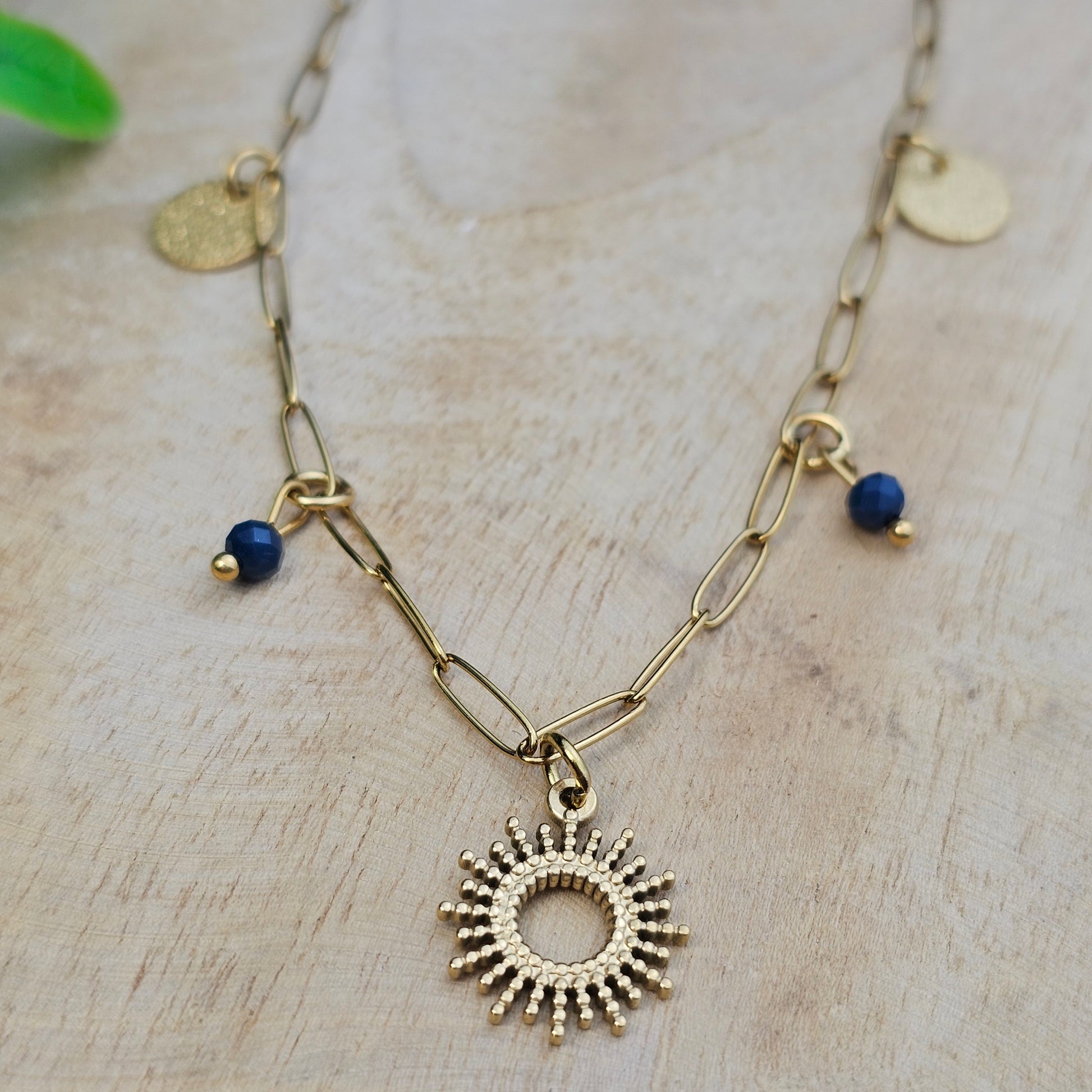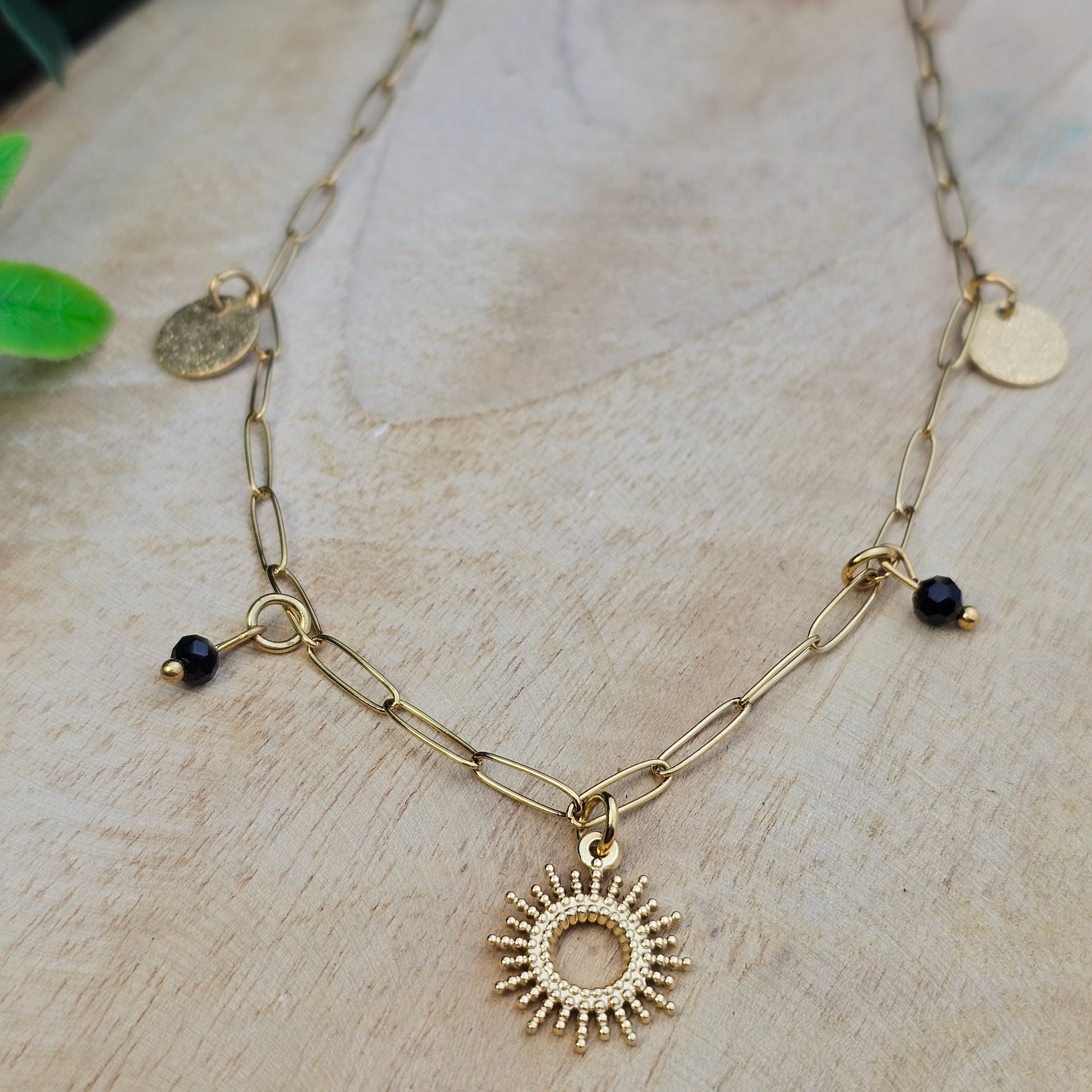 Collier en acier inoxydable doré, composé de pendentifs en acier inoxydable et de perles de verre.