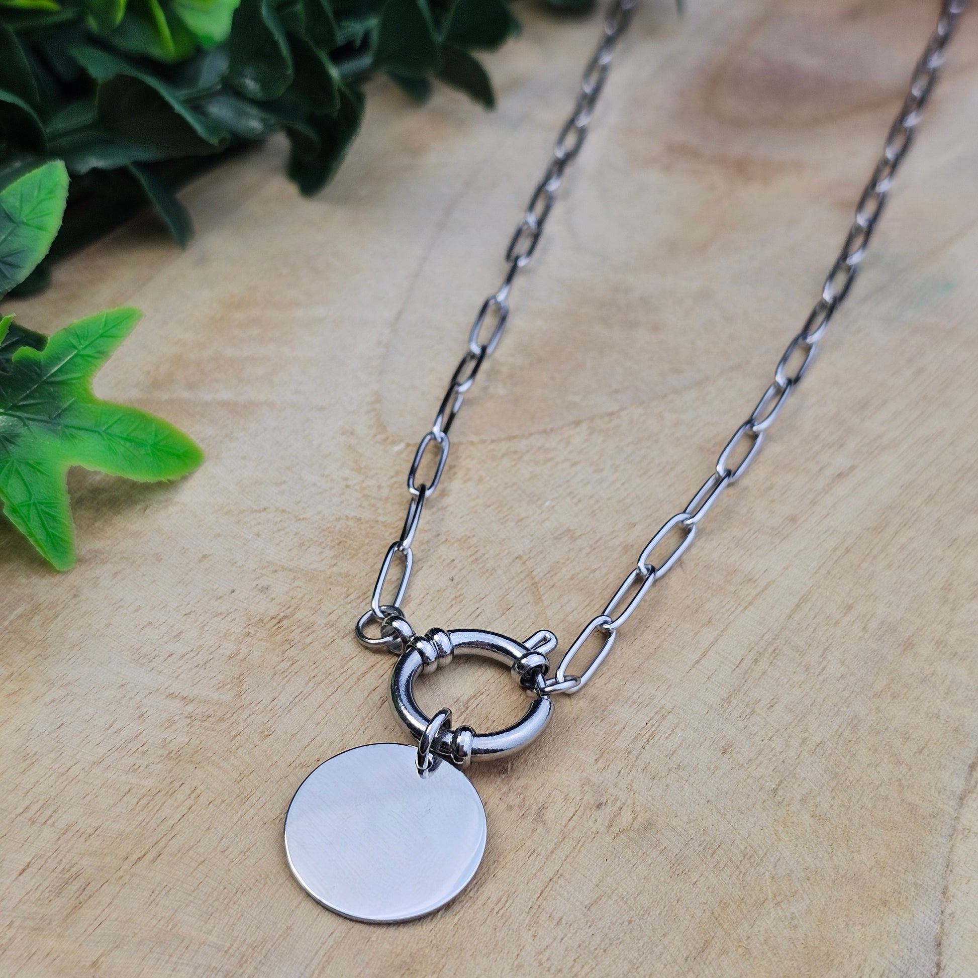 Collier maille agrafe et grande médaille en acier inoxydable argenté.