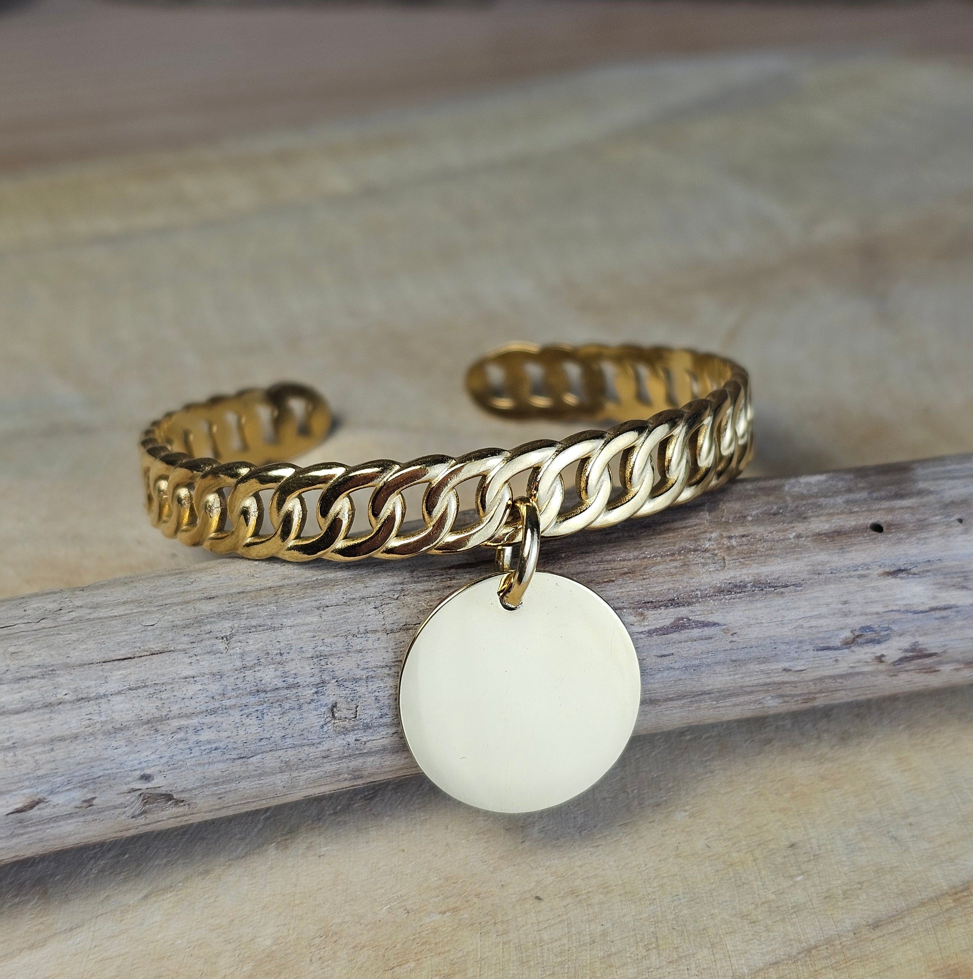 Jonc avec médaille en acier inoxydable doré.